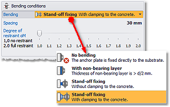 The lever arm corresponds to the distance between the concrete surface and the fixture. The enlargement of the lever arm due to possible concrete spalling near the surface during drilling needs not to be considered. It is automatically considered by DesignFiX for stand-off fixings without clamping of the anchor against the concrete surface. The value αM takes into account a possible restraint of the anchor on the side of the fixture. It shall be assessed in each individual case by the user and can be between αM = 1,0 (no restraint) und αM = 2,0 (full restraint). Please note that the fixture must be able to take up the restraint moment. In case of doubt it is recommended to assume αM = 1,0. |