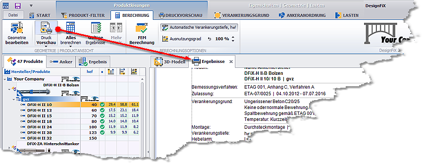 Unter der Voraussetzung, dass ein Bemessungsergebnis existiert, führt Sie der obere Teil des Buttons zur Druckvorschau mit den Ergebnissen. Mit dem unteren Teil des Buttons stehen Ihnen verschiedene optionale Einstellungen zur Verfügung (vgl. Druckvorschau).