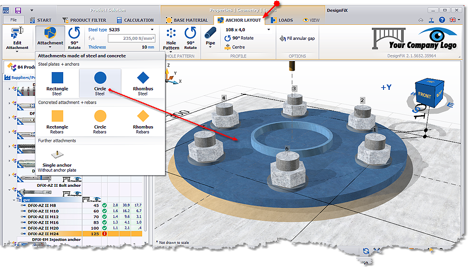 To distinguish attachments made of steel or concrete, an option to select further types of attachment is introduced on the tab ANCHOR LAYOUT. In addition to anchor plates made of steel, concreted attachments (rectangular, circular, rhombic) are available that are fastened with reinforcement bars. The choice of the attachment type automatically influences the product selection.